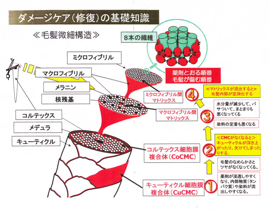 簡単に語弊を恐れずに言いますと髪の毛が傷むとカラーやパーマが私たち技術者の思い通りにならないと言うことです。髪の毛は主にケラチンというタンパク質とその間を埋め尽くすようにCMCと言う細胞間脂質という髪の毛を構成している物をくっつけている接着剤のような物で出来ています。