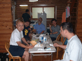 ログハウスに入ってただいま調理中!総勢9人いましたが炭をいこしていたりで集まりません。奥に写っているのはオファーの調理人山畑さんです。この人たちなにしてんでしょうかね。